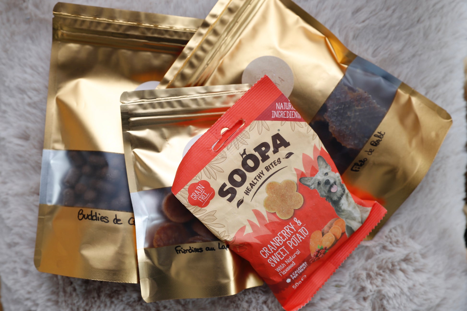 - 4 sachets de friandises : Filets de poulet 100G, Buddies de Cerf 100G, petits ronds de Lapin 80G, SOOPA Cranberry patate douce 50G