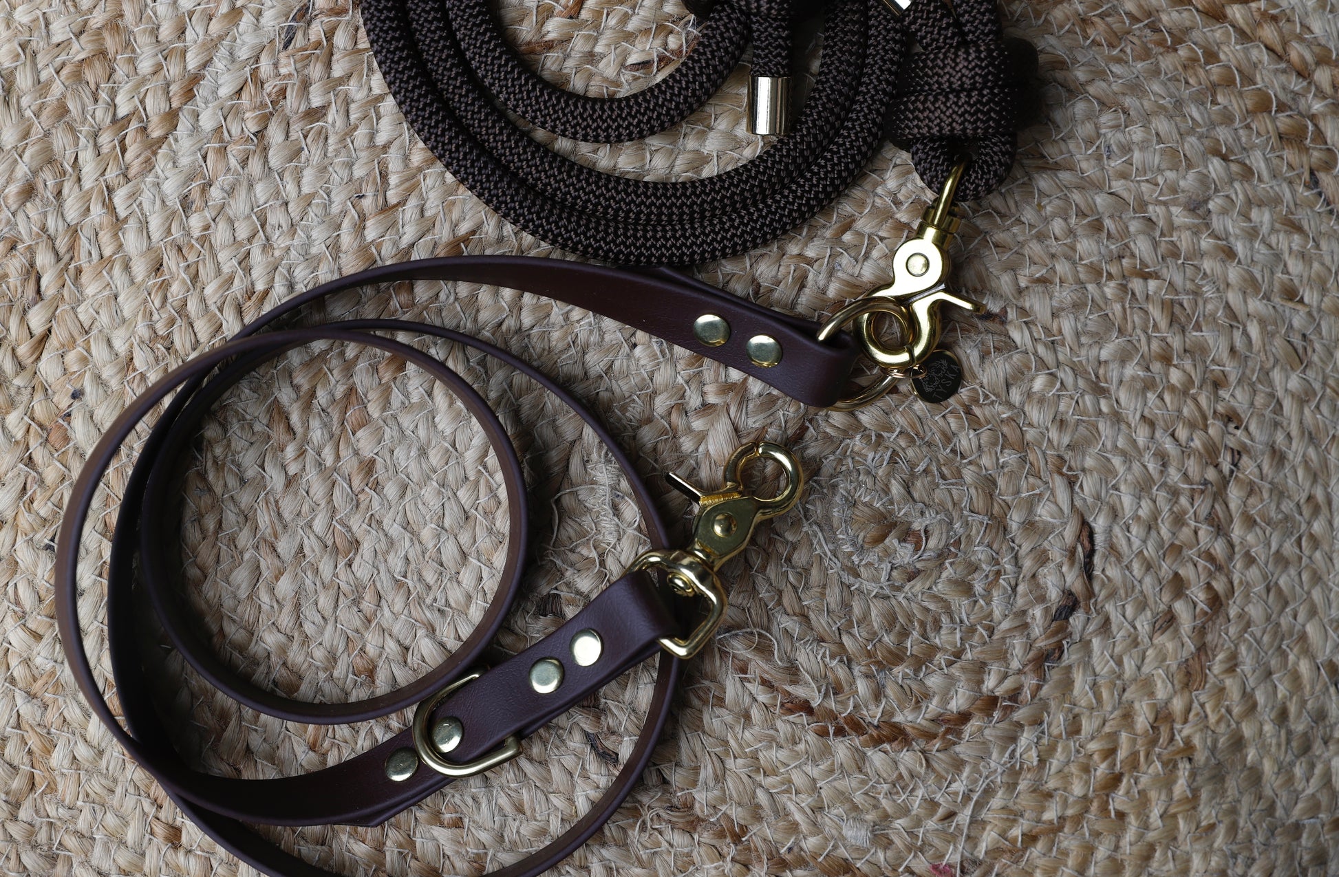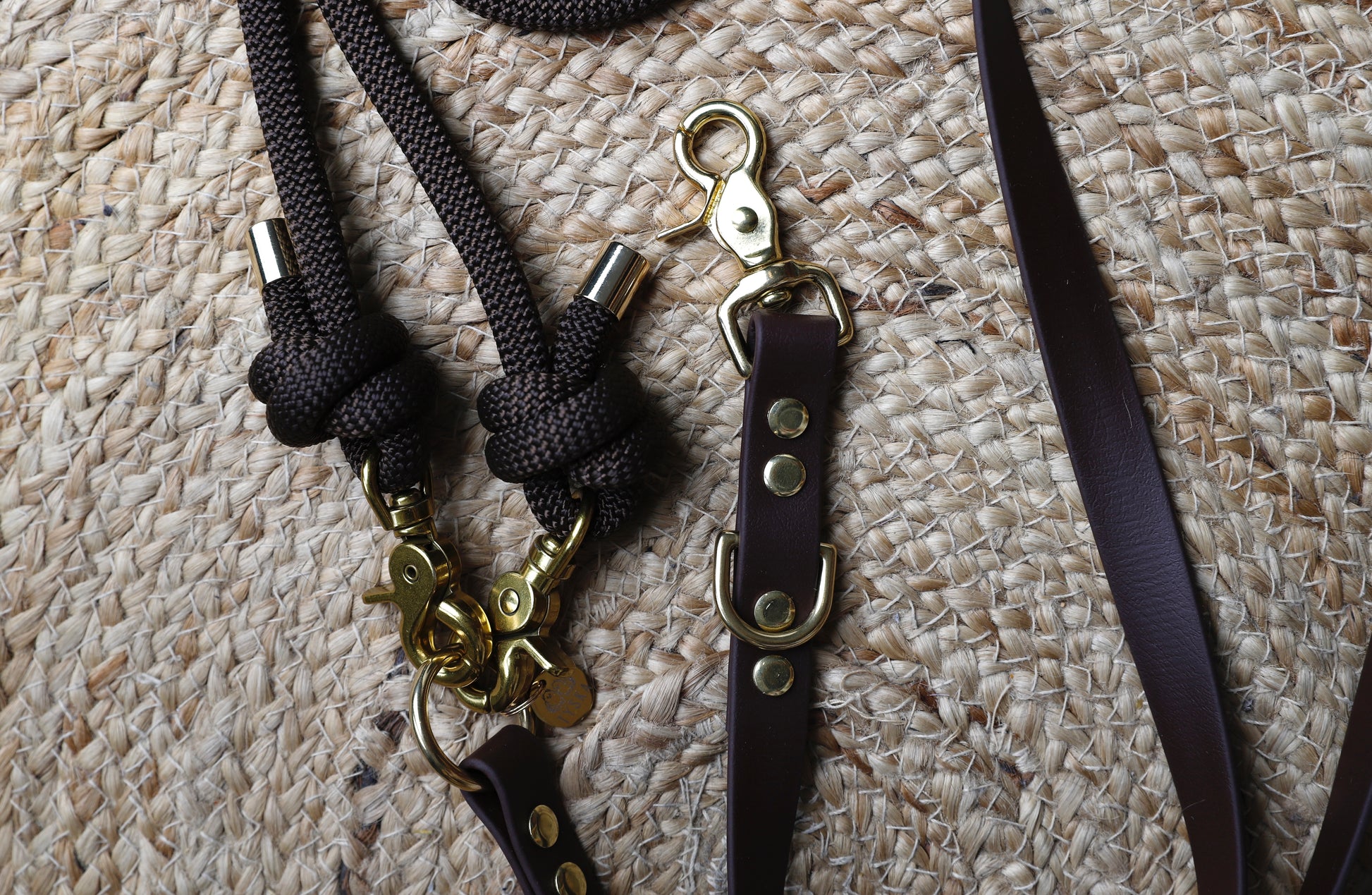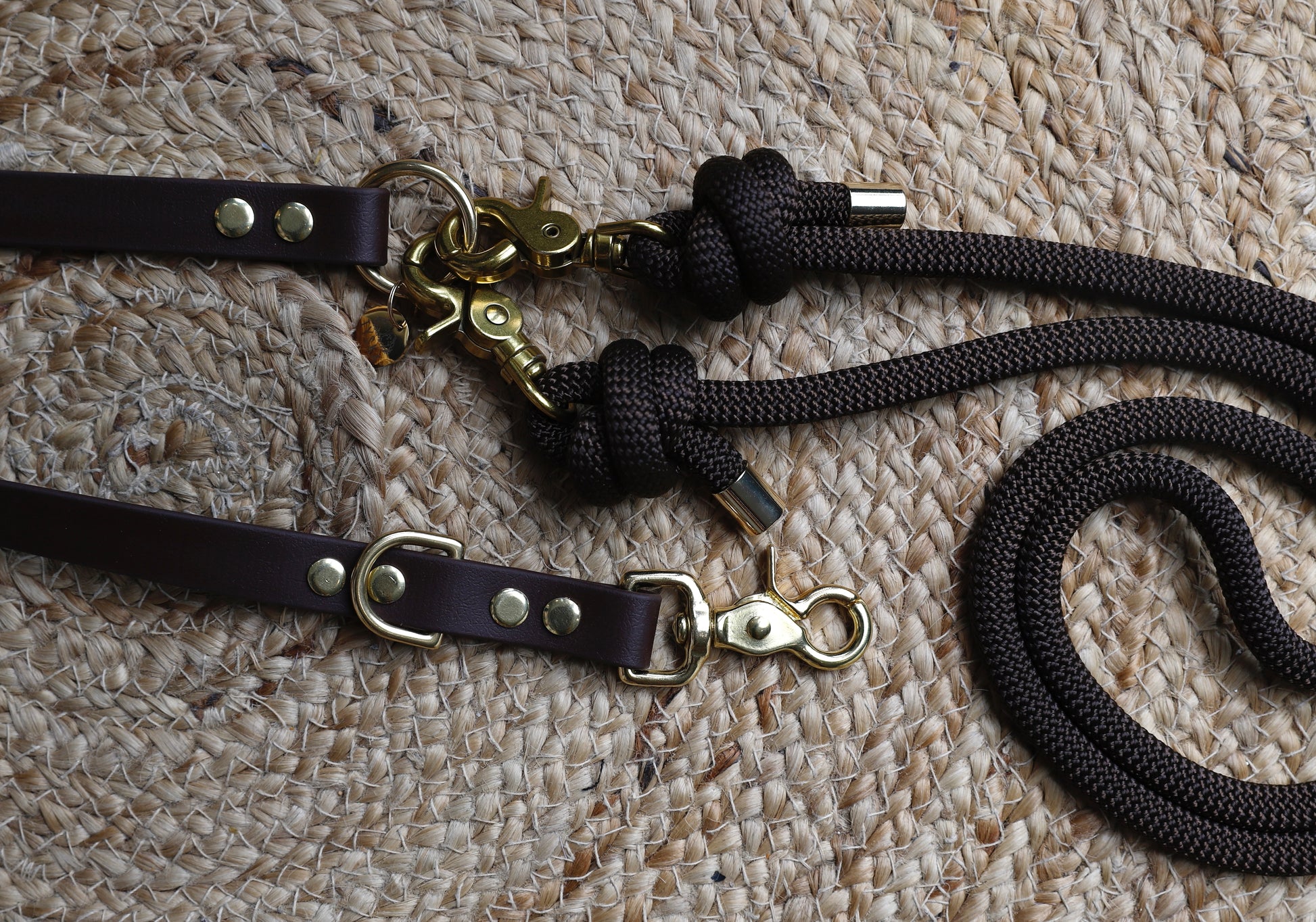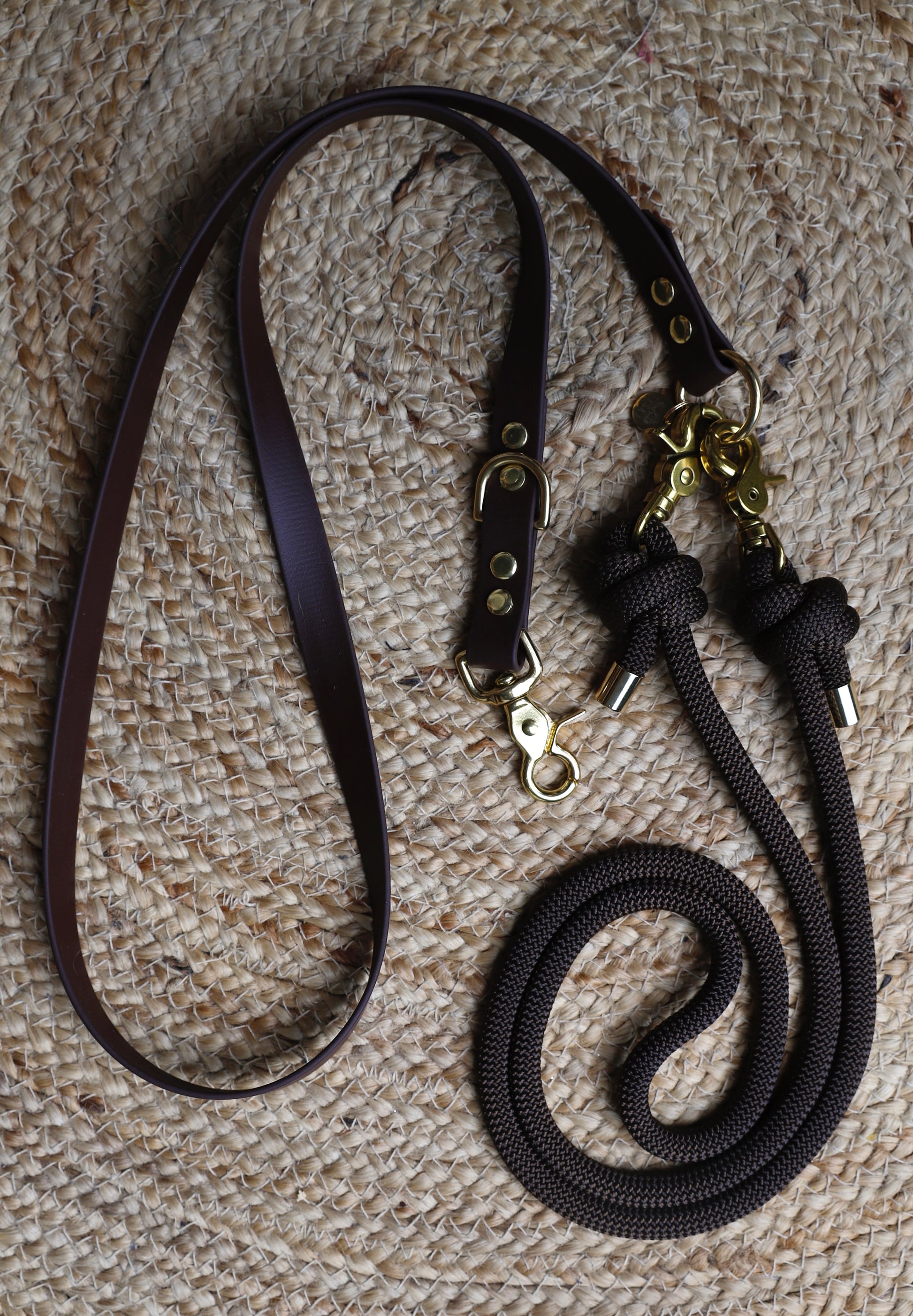 Cette laisse multiposition 3 points en main-libre faite en double matière, corde et Biothane. La partie corde mesurant 125cm possède à chaque extrémité des mousquetons vous permettant de changer de couleurs à souhait. La partie biothane mesurant également 125cm. La bouclerie dorée est en Laiton massif (résistant au sel de mer et à la rouille)